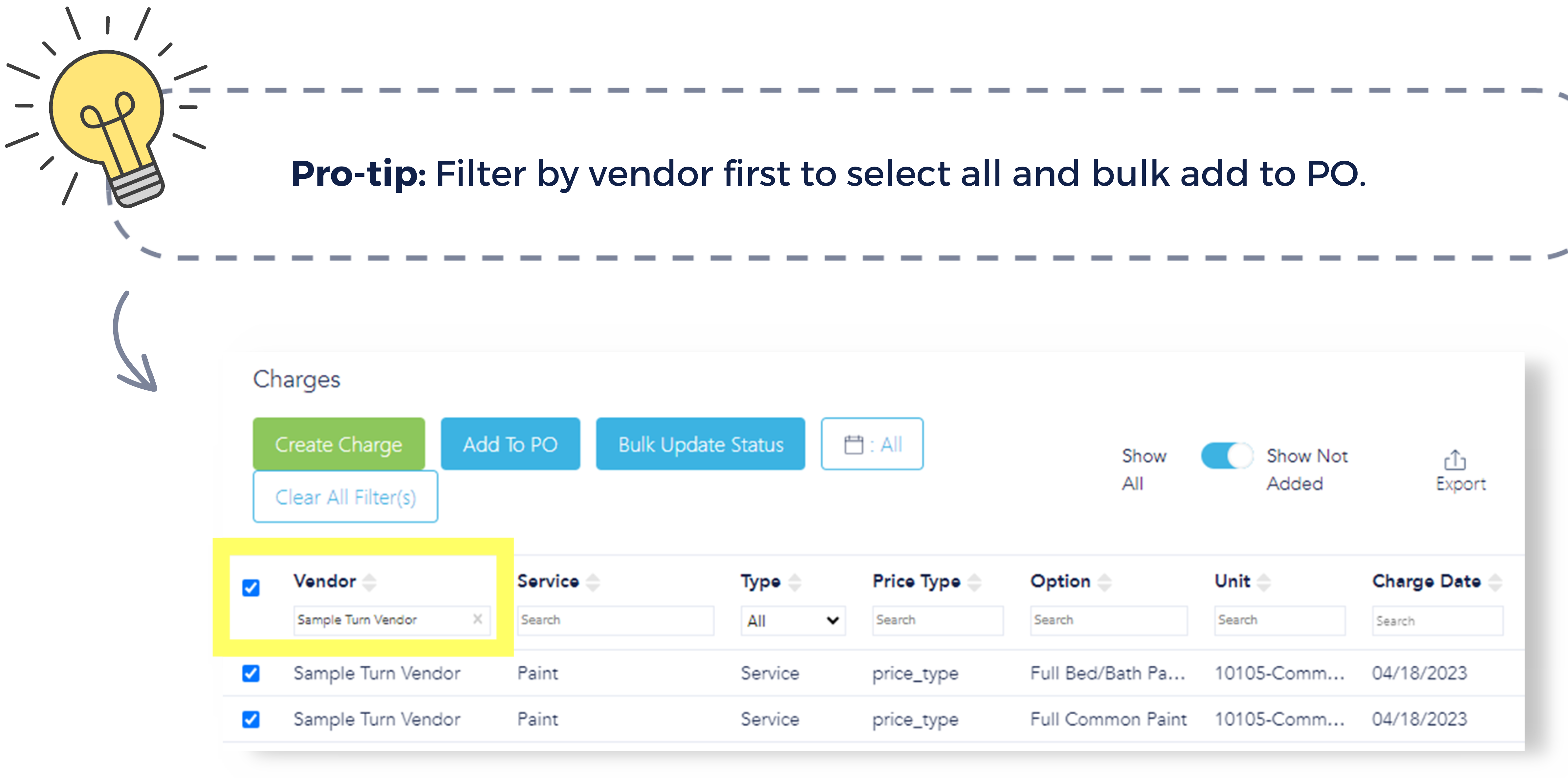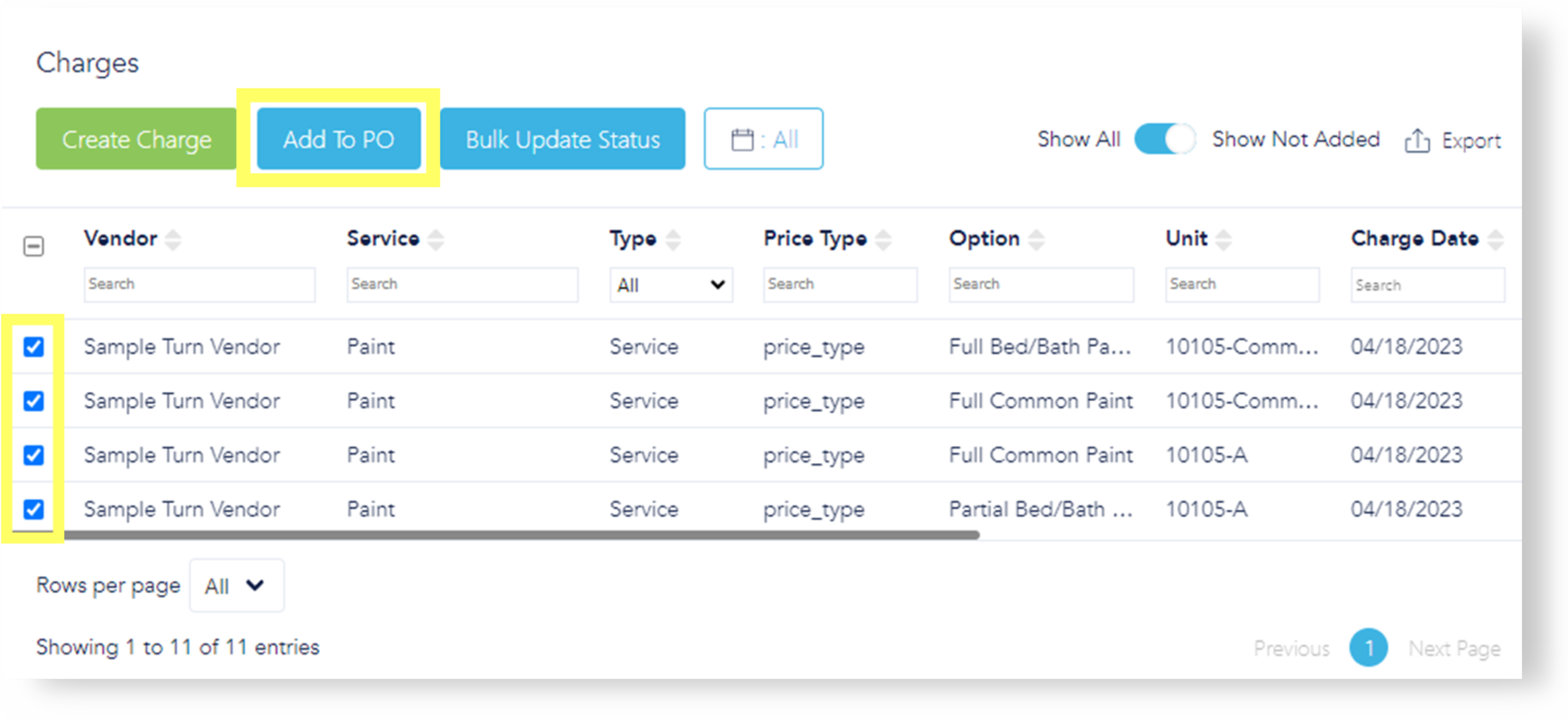 To add charge(s) to a Purchase Order (PO) at your desired cadence, check the respective box(es) and select "Add to PO."