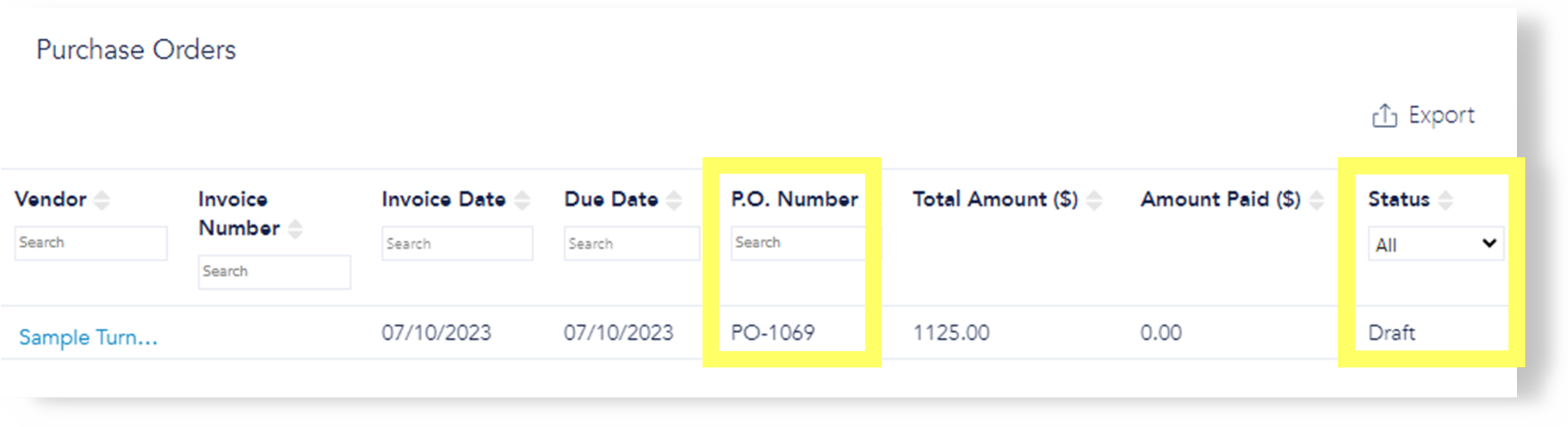 The status of the charge(s) changes to "Added," the PO number is now provided, and the PO is in "Draft" status.