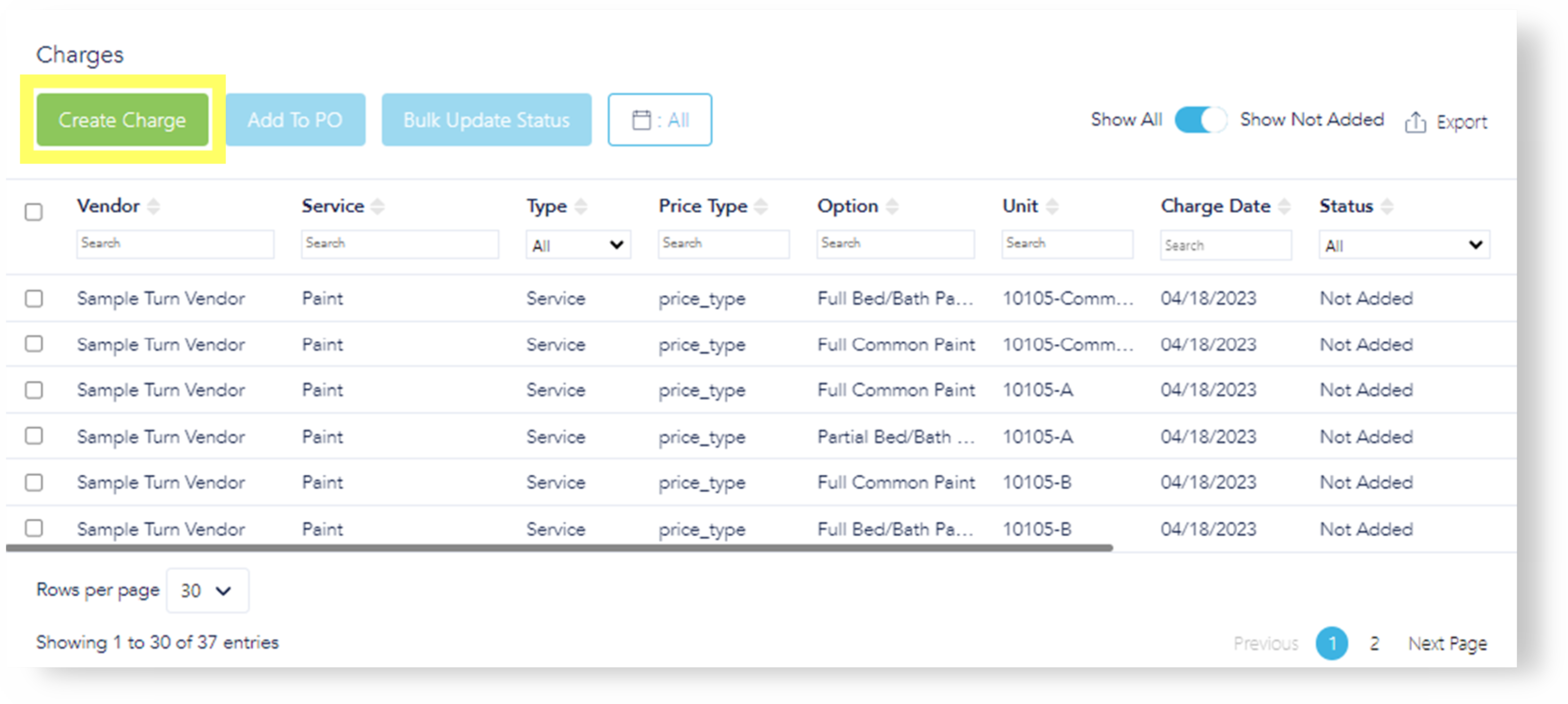 Select charge(s) to add and then "Add to PO"- choose to create new or add to existing.