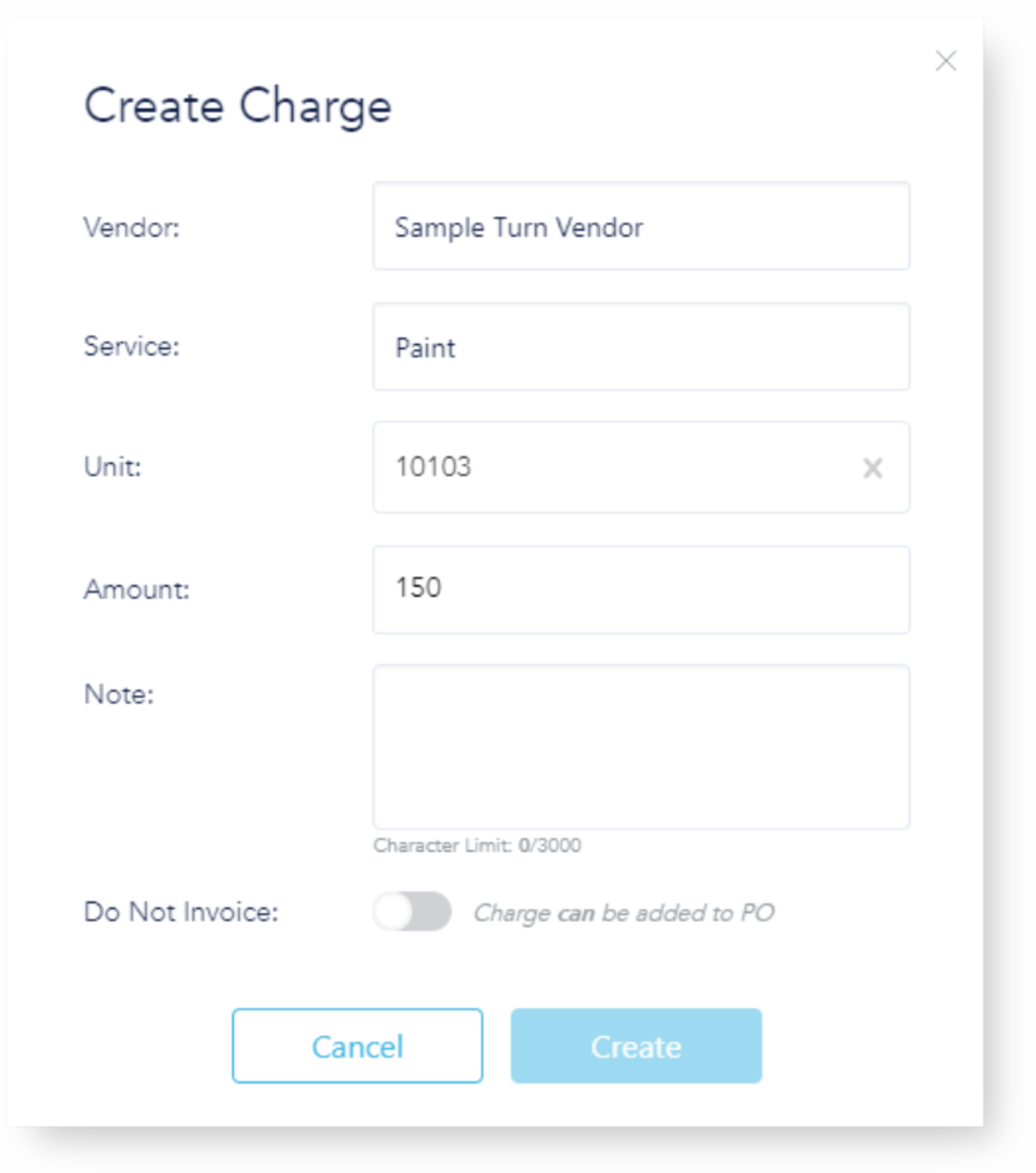 Complete the requested information in the pop-up. Invoice option default is set to add created charge to a PO. Toggle off if you do not want to add a created charge to a PO.