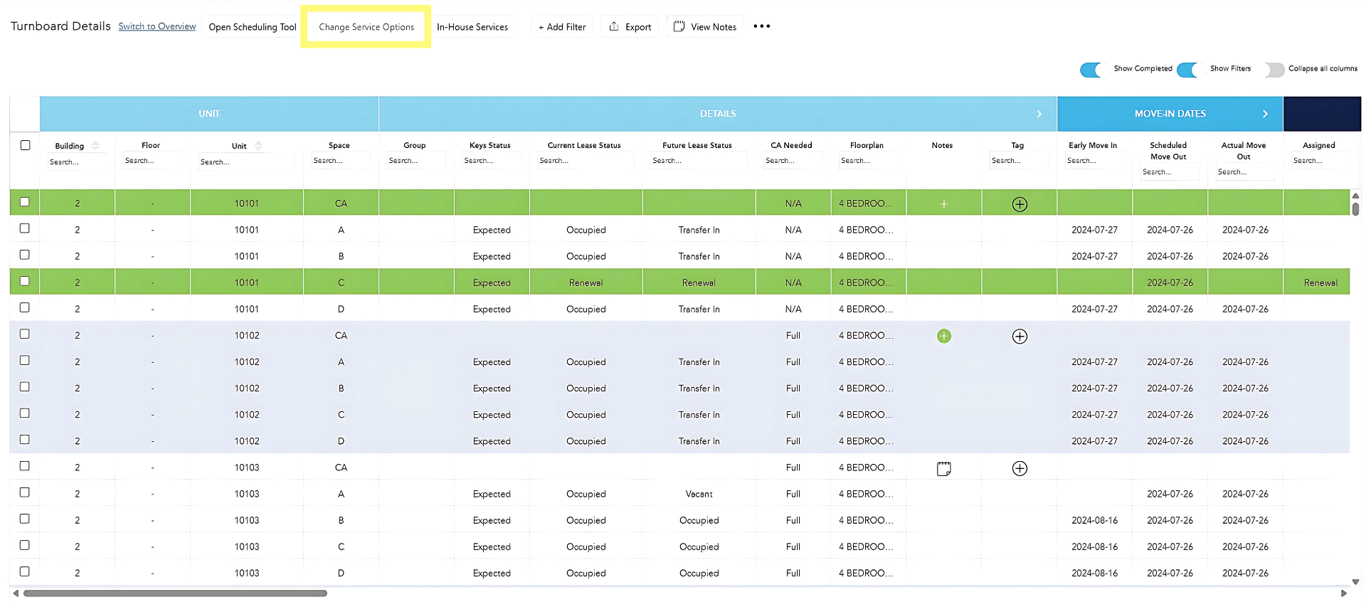 To make changes to the work that needs to be completed in a space based on the imported inspection results, while in Detail View, click on Change Service Options.