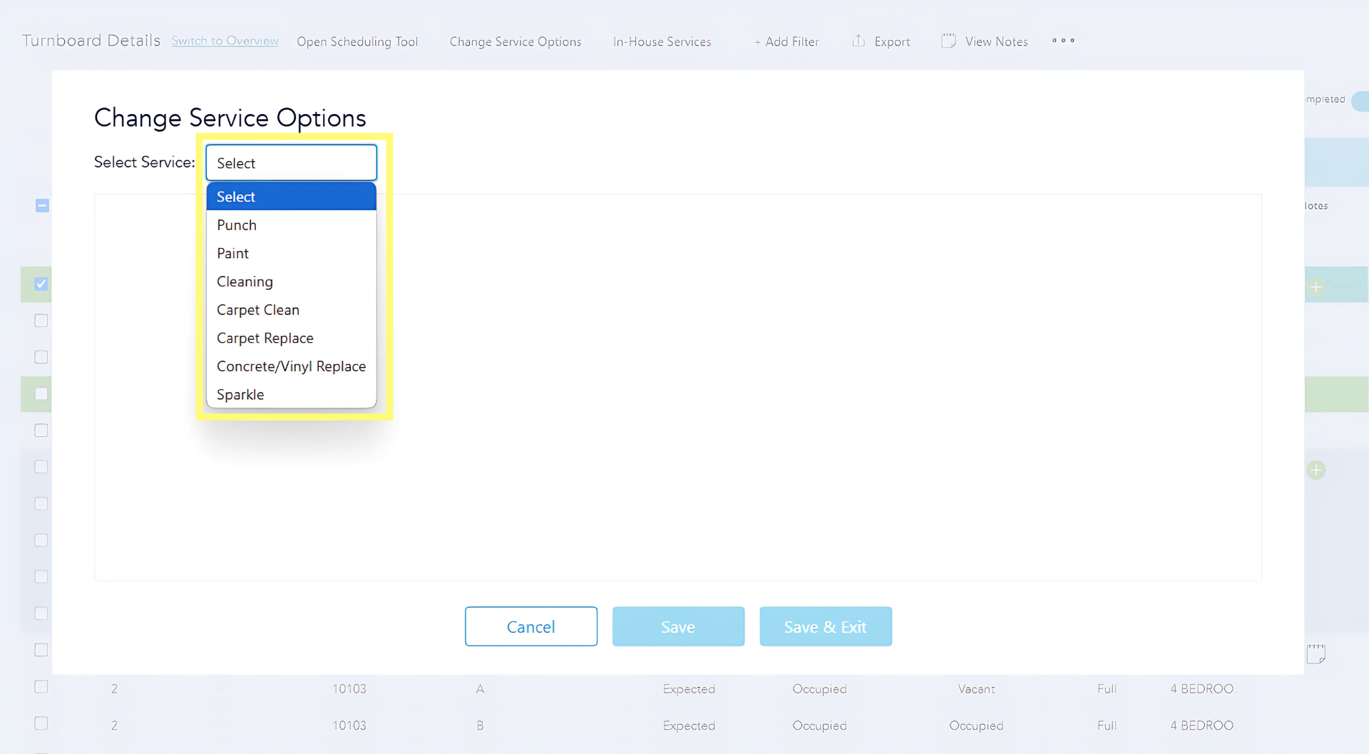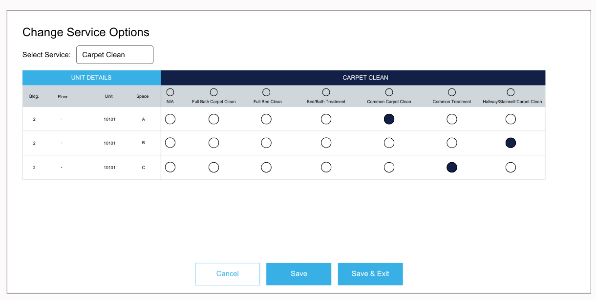 A list displaying all spaces that require the service will appear, with the current work to be completed already filled in. To change the work that should be completed, select N/A, then select the radial button for the service desired for the respective space(s) and click Save to remain in the Change Service Options screen. To make additional changes, select another service option to update from the dropdown menu. Once all updates are completed, select Save and Exit to save your changes and return to the Turnboard.