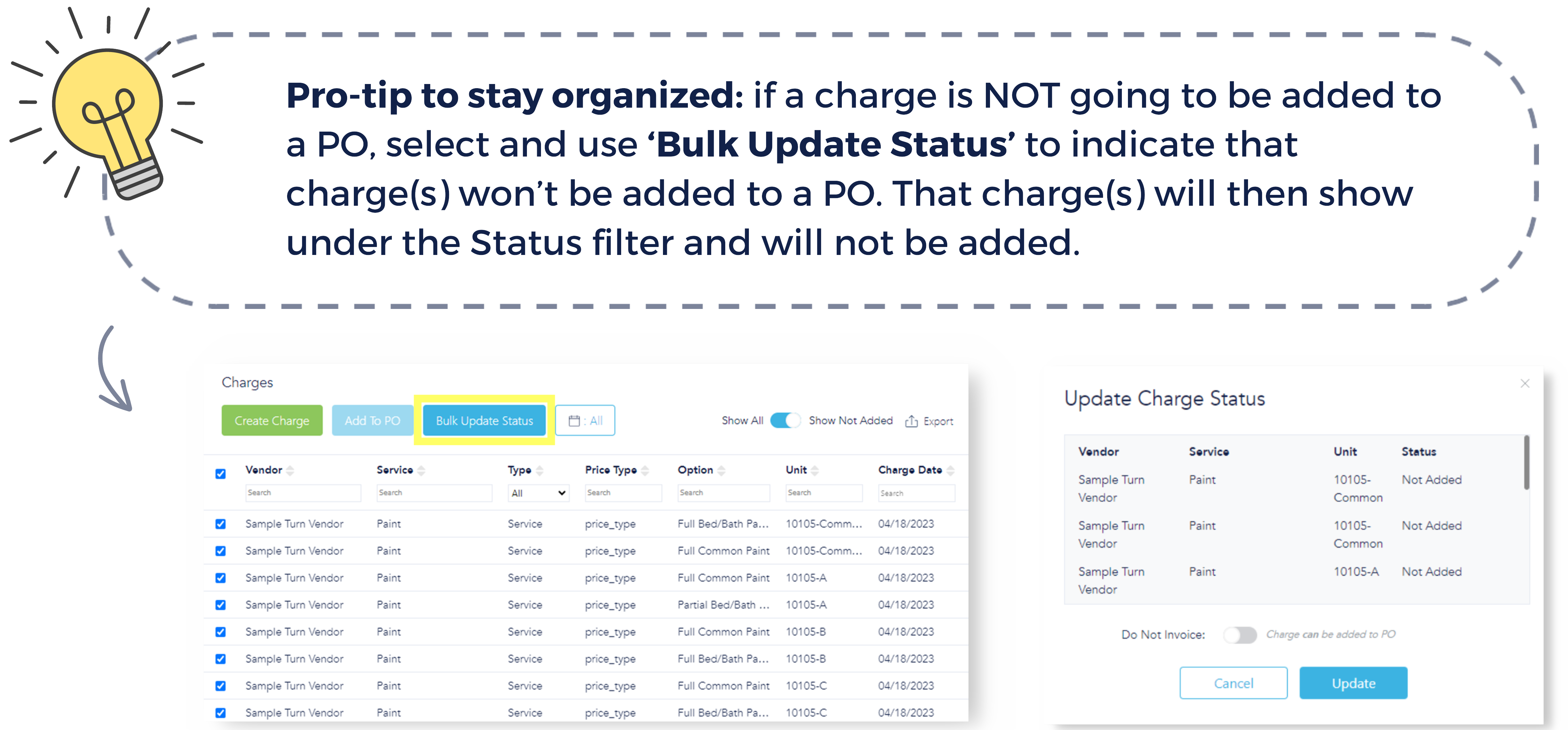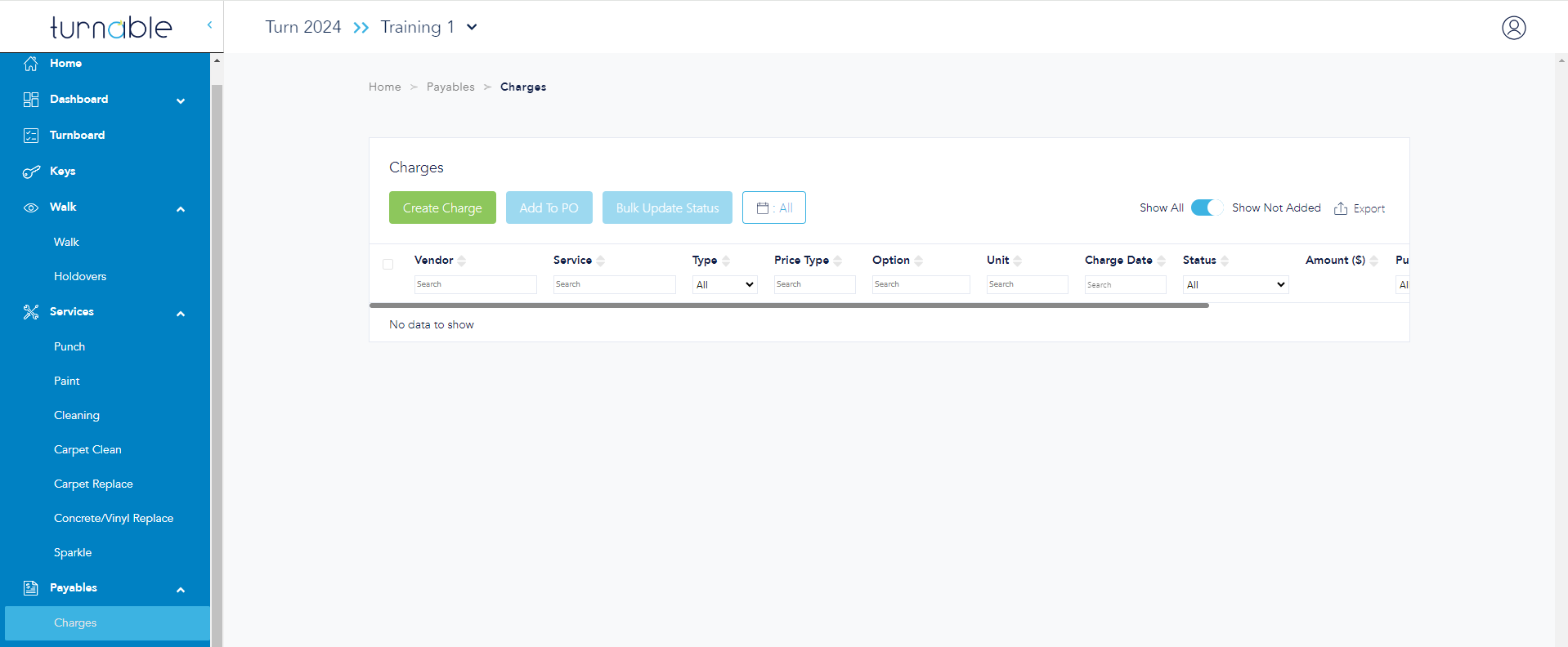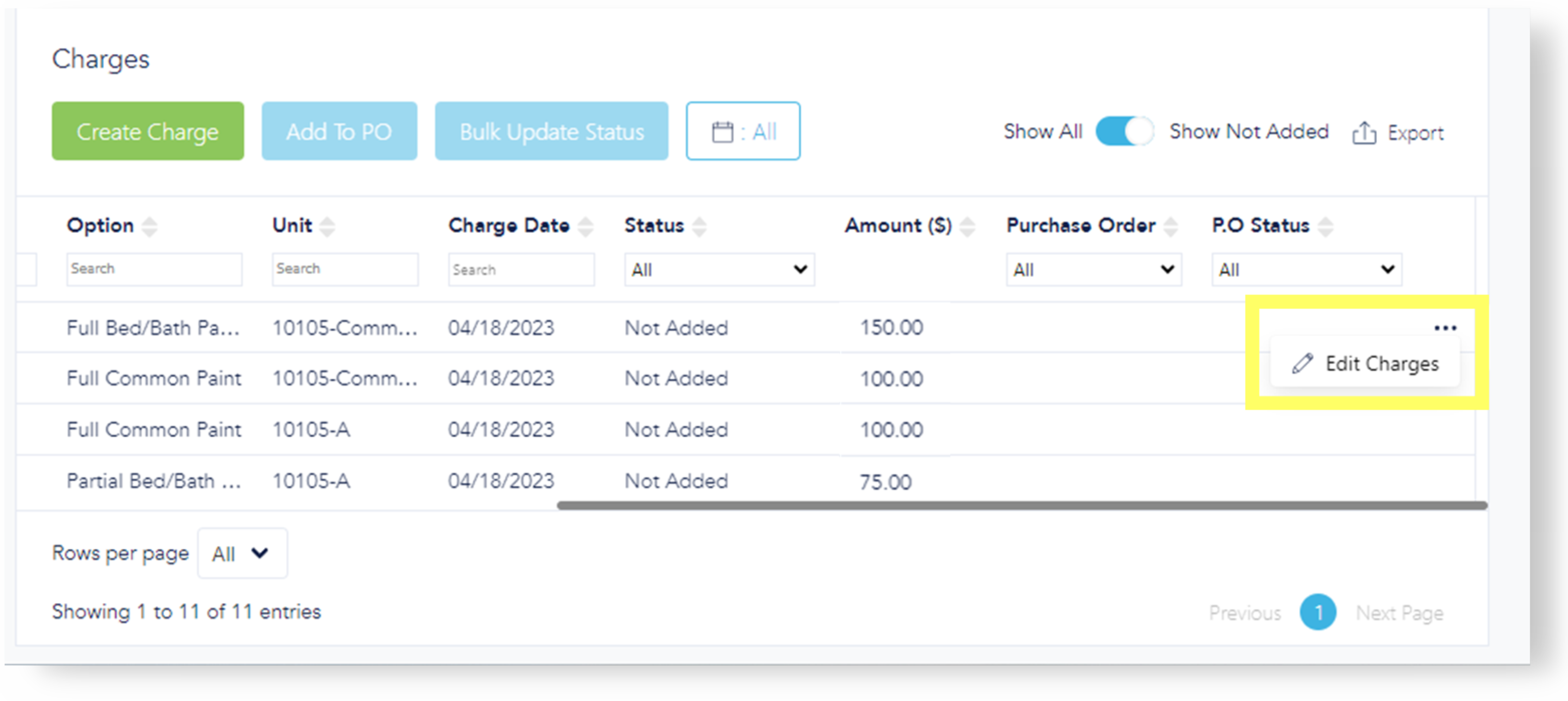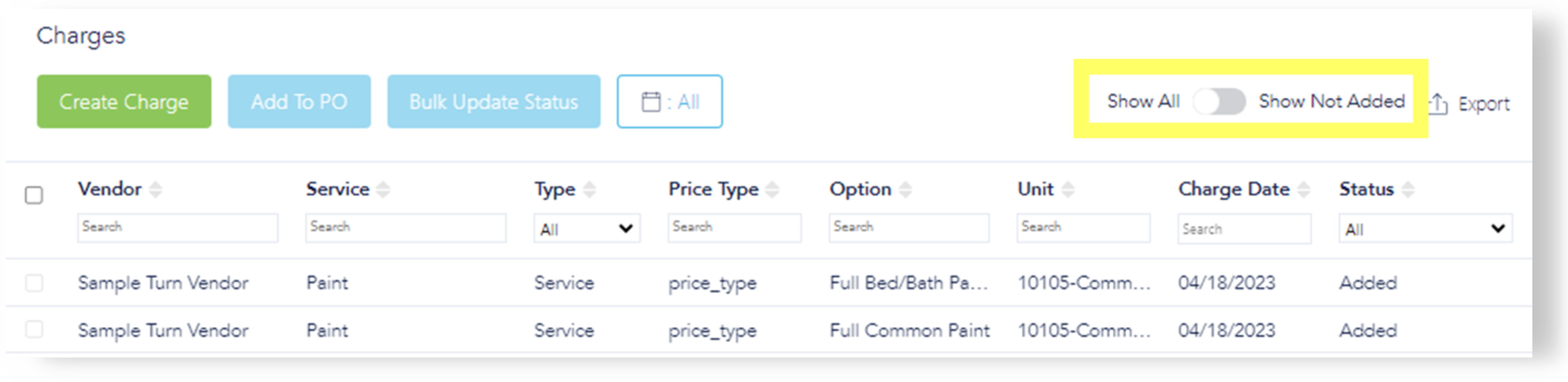 This toggle default setting shows only those charges not yet added to a PO. Toggle again to show everything, including PO number and status.
