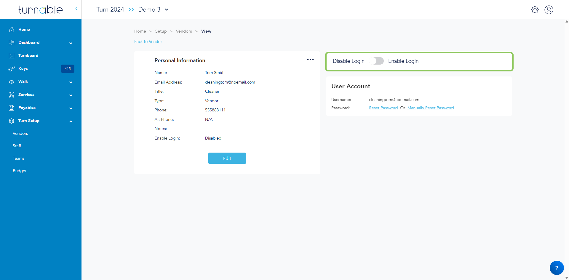 If you have vendors that no longer need access to Turnable, disabling their login is as easy as toggling off a switch!