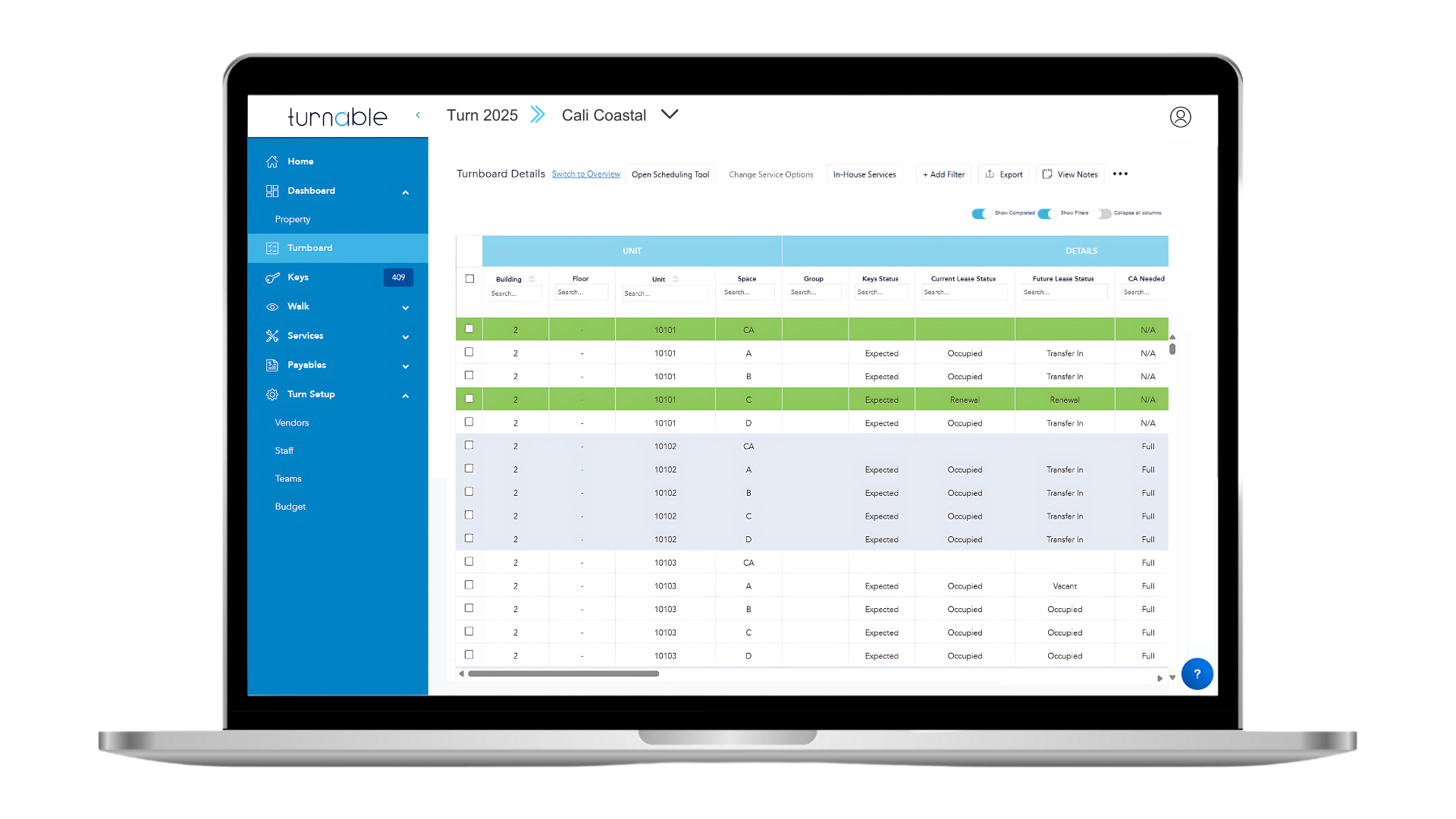 From high-level vendor service progress to detailed unit data, the Turnboard offers a comprehensive view of your portfolio. Easily toggle between views, apply dynamic filters, and add notes and tags for enhanced organization. With the Scheduling Tool, pre-schedule work efficiently before move-out inspections or primary turns, ensuring smooth operations. Need to make changes? Simply use the "Change Service Options" feature. Explore the "Additional Options" menu for advanced functionalities like marking units as "As-Is" or overriding lease status. For a broader perspective, switch to the Overview mode.