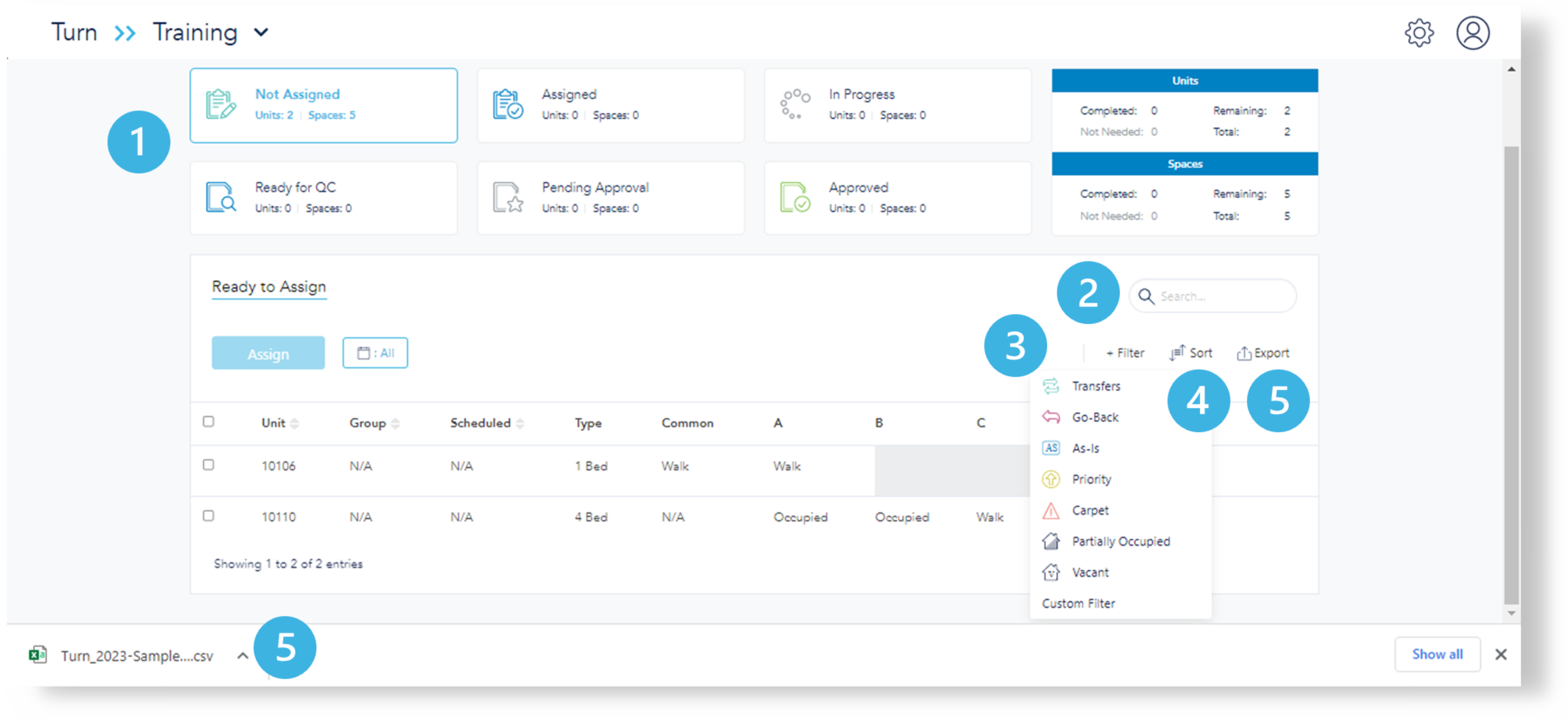 - Filter your search by Transfers, Go-back, As-Is, Priority, Carpet, Partially Occupied or by a custom filter using the additional options.